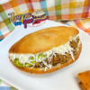 La Callejera -Arepa Frita, carne de hamburguesa, pollo a la plancha, tocineta, un huevo frito, jamón, queso llanero, queso muenster, y salsa rosada. / Fried arepa, filled with a hamburger patty, grilled chicken, bacon, a fried egg, ham, white cheese, muenster cheese and our delicious pink sauce.