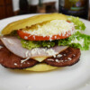 La Gringa – Arepa frita, carne de hamburguesa, jamón, un huevo frito, queso, lechuga, tomate y salsa rosada