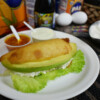 / Fried arepa filled with salami slices, ham, a fried egg, cheese, lettuce, tomato and our delicious pink sauce
